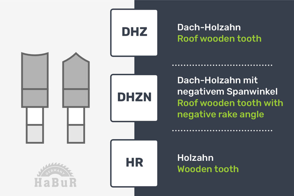 Der Dach-Hohlzahn ist eine Sonderform mit angeschrägtem Zahnrücken und hohler Schneidkante. Diese Geometrie eignet sich besonders für Laminatzuschnitte ohne Vorritzsäge und wird häufig in Horizontalplattenaufteilsägen eingesetzt. Die aufwendige Nachschärfung macht diese Zahnform zwar kostenintensiver, dafür liefert sie ein sauberes Schnittbild bei empfindlichen Oberflächen.