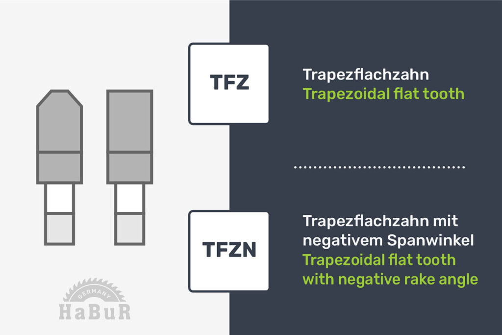 Diese Zahnform kombiniert abwechselnd einen trapezförmig abgeschrägten Zahn mit einem flachen Zahn. Der Trapezzahn dient dem Vorschneiden, der Flachzahn übernimmt das Nachschneiden. Diese Kombination ist ideal für saubere Schnitte in beschichteten Plattenmaterialien, HPL, MDF, Sperrholz oder NE-Metallen. Für Massivholz ist diese Zahnform nicht geeignet.